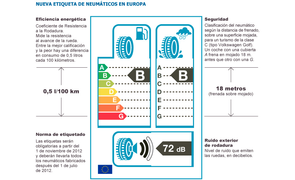 La etiqueta europea es obligatoria desde el año 2012 en todo aquel neumático que se comercialice en la Unión Europea. Esta etiqueta debe ser siempre visible y permite al consumidor final comparar cualidades y elegir aquel neumático que mejor se adapte a sus necesidades. En la etiqueta se pueden apreciar: